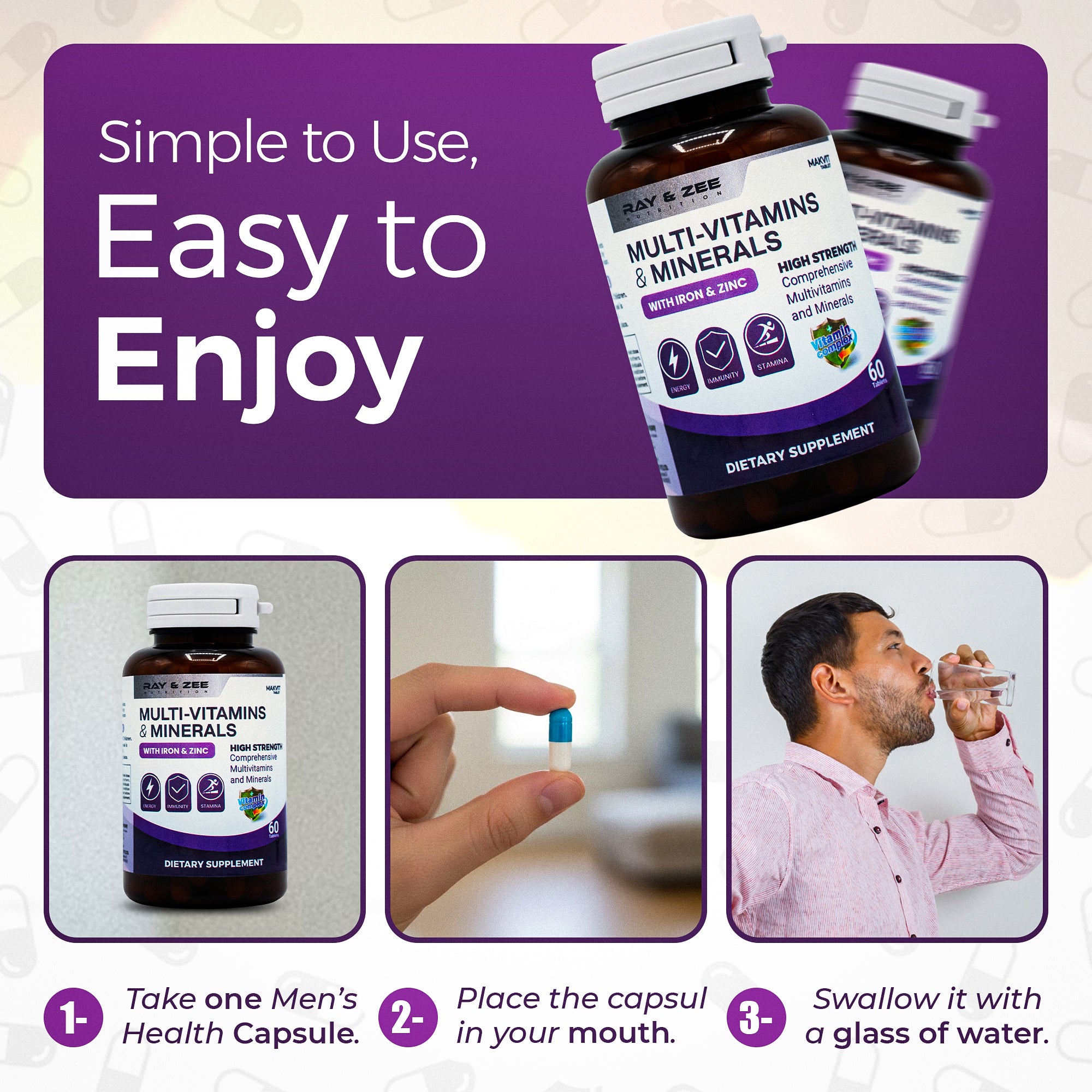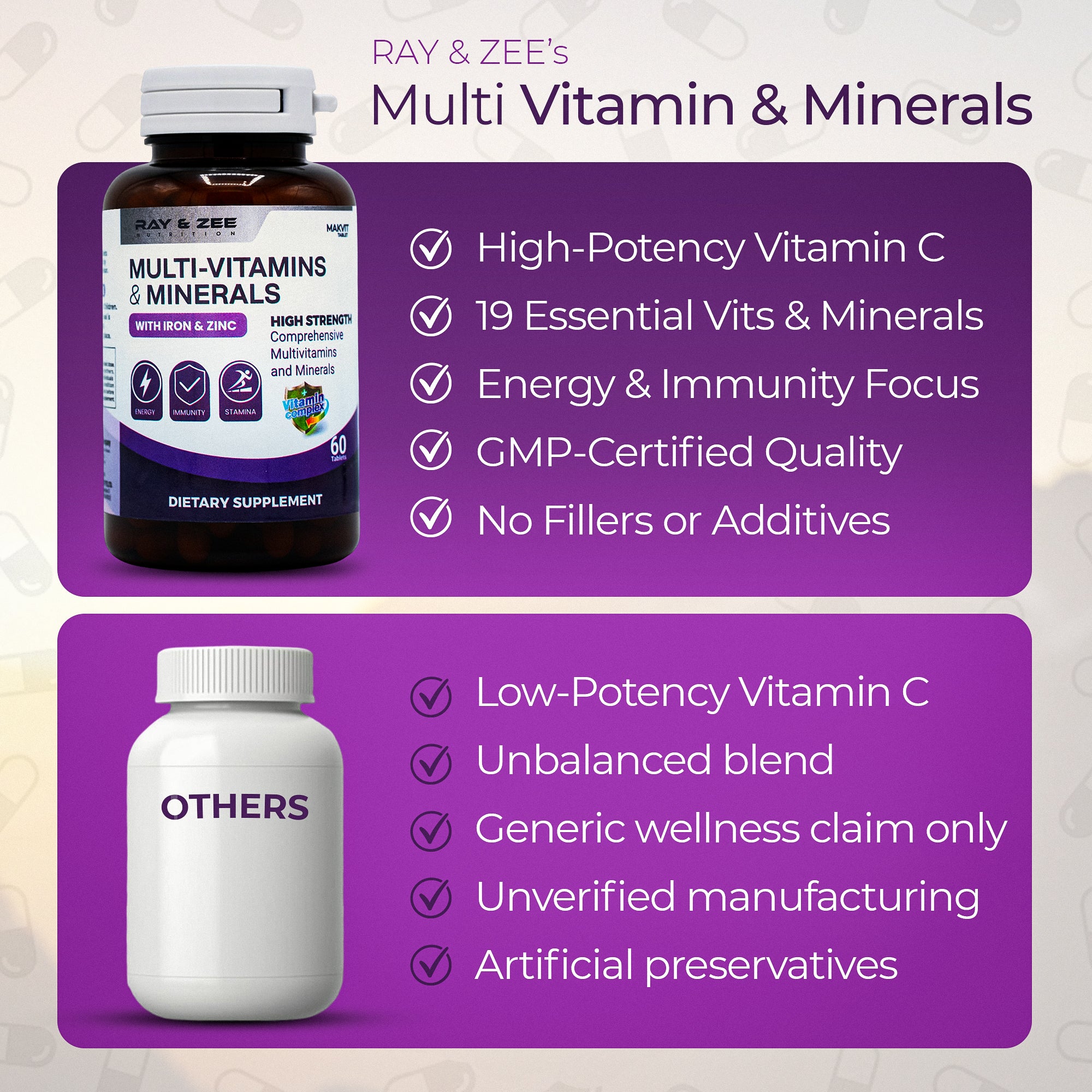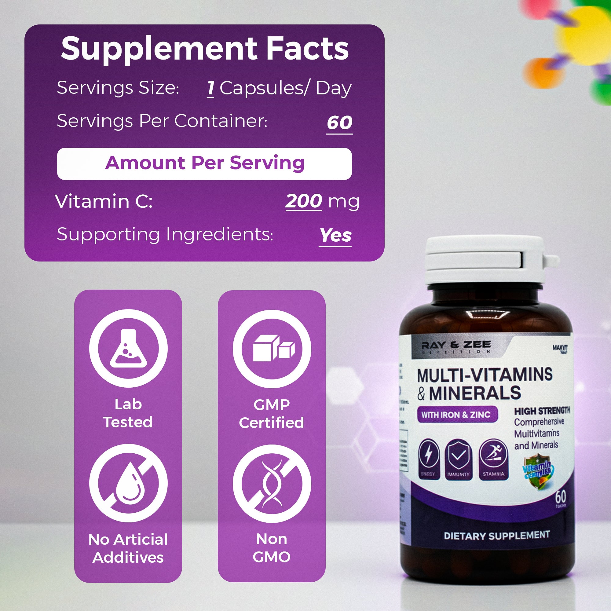 RAYNZEE’s Multivitamins & Minerals is an all-in-one daily supplement designed to support energy, immunity, and overall wellness. Formulated with a balanced blend of essential vitamins and key minerals, it helps boost metabolism, strengthen the immune system, and promote healthy bones and mental clarity.